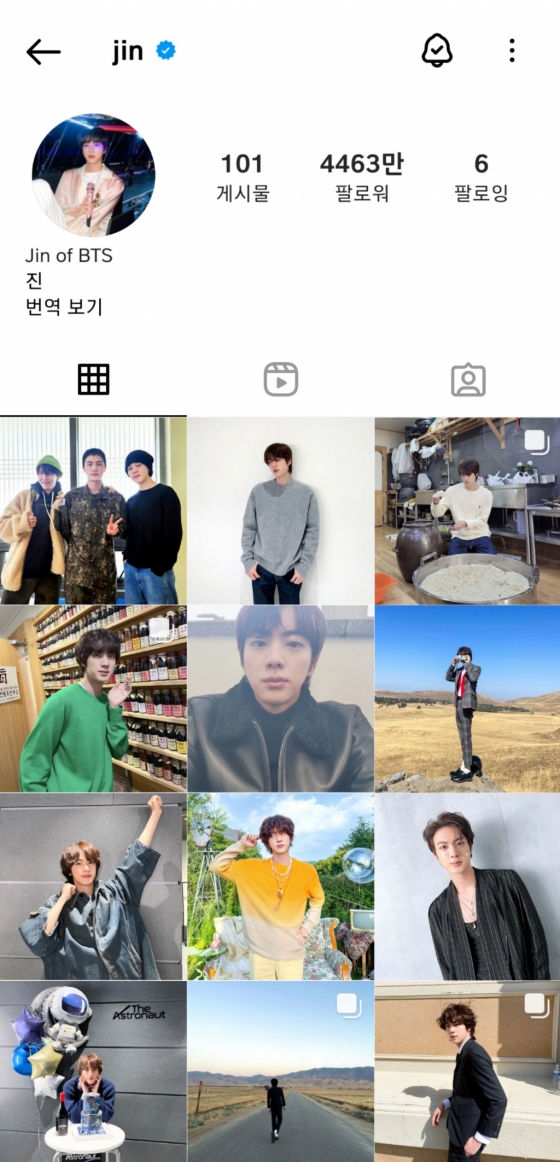 '미의 남신', '보컬킹'이라는 닉네임을 가진 대표적인 글로벌 슈퍼스타이면서도 소탈함이 엿보이는 진의 인스타그램 또한 뜨거운 사랑을 받고 있다. 진의 인스타그램은 지난해 12월 육군 현역 입대로 인해 게시물 업로드가 거의 멈추었음에도 불구하고 계속 증가하며 3월 31일 오전 현재 4463만 팔로워를 기록 중이다.