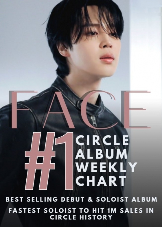 지민의 솔로 앨범 '페이스'(FACE)가 써클차트(구 가온차트)에서 솔로 아티스트 최단기간 100만을 돌파하며 12주 차(3월 19일~3월 26일) 앨범 주간 차트에서 1위를 차지했다.