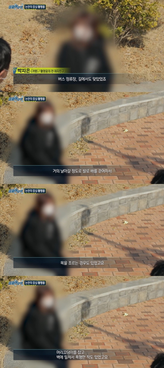 심지어 또 다른 동창은 황영웅으로부터 돈을 뺏겼다고 주장했고, 전 여자친구는 황영웅에게 상습적으로 폭행을 당했다고 밝혔다. 전 여자친구에 따르면 황영웅은 버스 정류장과 길에서도 전 여자친구를 때렸다. 그는 "날아갈 정도로 배를 걷어 차서 목을 조르는 경우도 있었다. 머리 끄덩이를 잡고 벽에 밀쳐서 폭행한 적도 있었다. 황영웅은 술을 먹고 화가 나면 주체를 못한다"고 말했다.