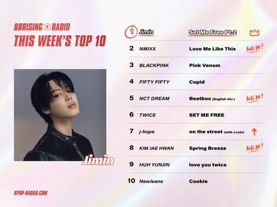 31일 케이팝레이더에 따르면 지민의 첫 솔로앨범 '페이스'(FACE) 수록곡 '셋 미 프리 파트.2'(Set Me Free Pt.2ㅊ)는 위클리 팬덤 차트 1위에 올랐다.
