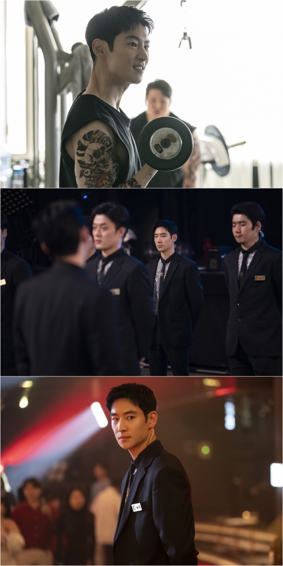 이 가운데 공개된 스틸에는 소위 '몸 좀 쓰는 형님'으로 변신한 도기의 모습이 담겨 있어 호기심을 자극한다. 민소매를 입은 도기는 묵직한 덤벨로 이두박근 펌핑을 하고 있는데, 팔뚝 위로 급조된 휘황찬란한 문신이 폭소를 자아낸다. 이어진 스틸 속 도기는 블랙썬 가드로 변신한 모습. 화려한 조명 아래에서 유흥을 즐기는 많은 사람들 속에서 날 선 존재감을 빛내는 도기의 모습이 단연 돋보인다. 이에 손님이 아닌 내부자의 신분으로 블랙썬을 다시 찾은 도기가 그곳에서 온하준의 흔적을 찾아낼 수 있을지 귀추가 주목된다.