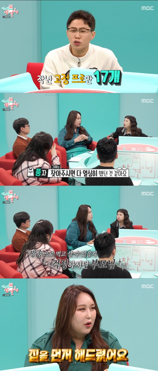 이날 MC 전현무는 풍자가 작년 고정 프로그램만 17개였다고 언급했다. 이에 풍자는 "찾아주시면 다 열심히 했다. 지금도 10개 정도 한다"라고 답했다. 방송 출연 후 가족들의 반응을 묻는 송은이의 질문에는 "사람들이 공공장소에 가면 알아봐주니까 은근히 좋아한다"라고 솔직히 답했다.