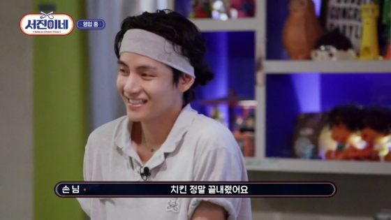 손님들이 "프로 셰프들이라고 해도 믿겠다. 특히 치킨. 정말 끝내줬다"고 하자 뷔는 양손을 흔들며 행복해했다.
