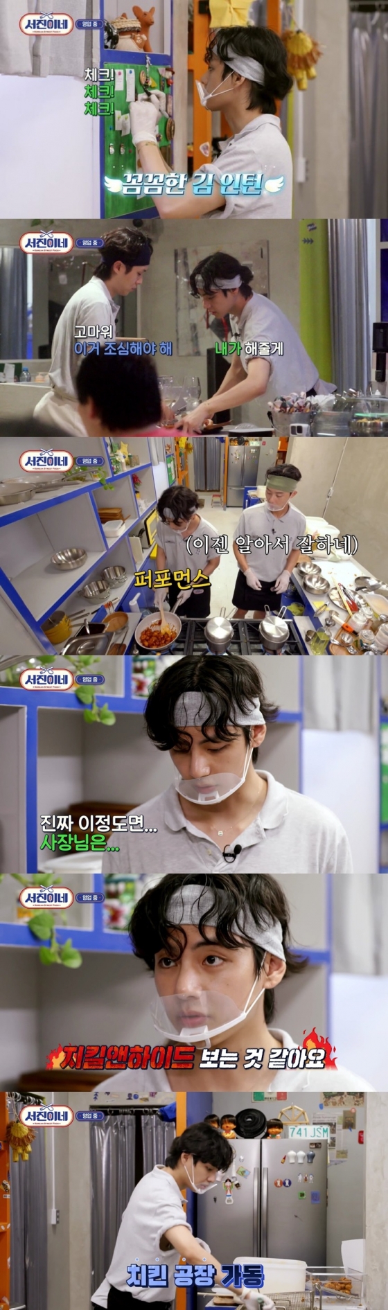 박서준이 승진의 조건이 '속도'라고 하자 뷔는 신속하고 야무지게 치킨을 뚝딱 완성한 뒤 멤버 'RM'의 솔로곡 'Still Life'를 부르며 춤을 춰 팬들을 즐겁게 했다. 또 "스피드가 붙었다"는 제작진의 칭찬에 으쓱해진 뷔는 "저 래펍니다"라고 짧게 랩을 선보여 깨알 웃음을 선사했다.