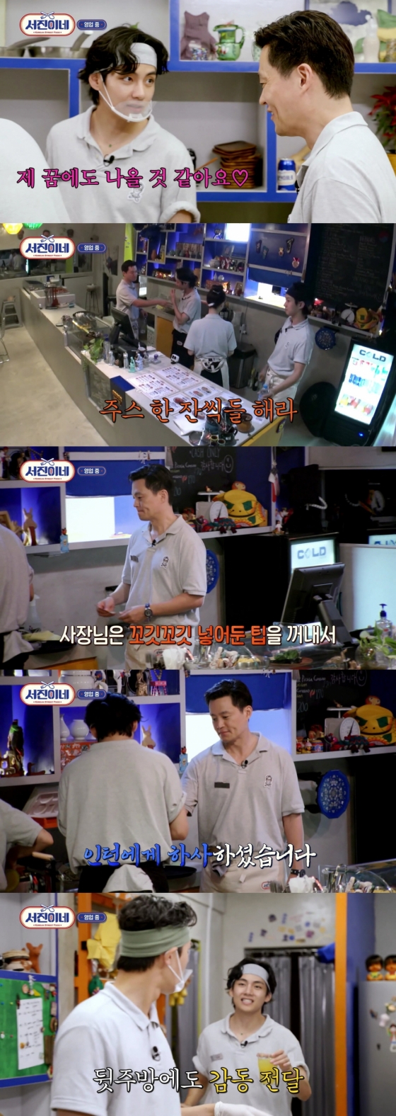 엄청난 매출에 이서진이 좋아하고 있다는 말을 전해 들은 뷔는 "진짜 이 정도면 사장님은 지킬 앤 하이드 보는 것 같다"는 센스 넘치는 답변을 했다.