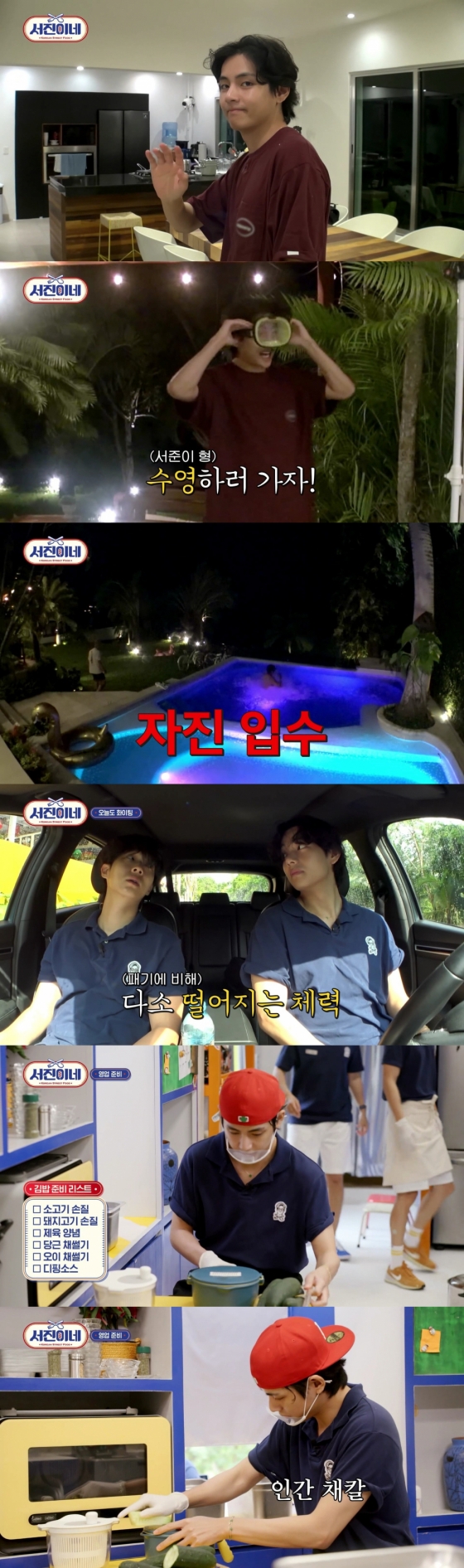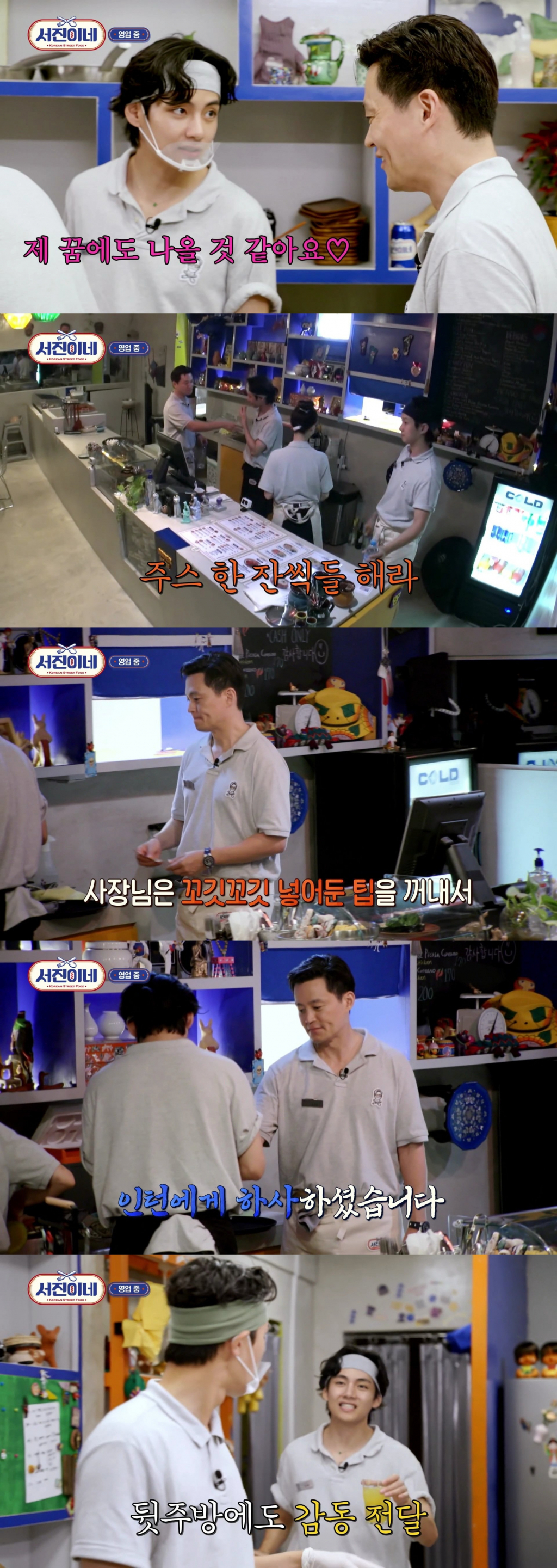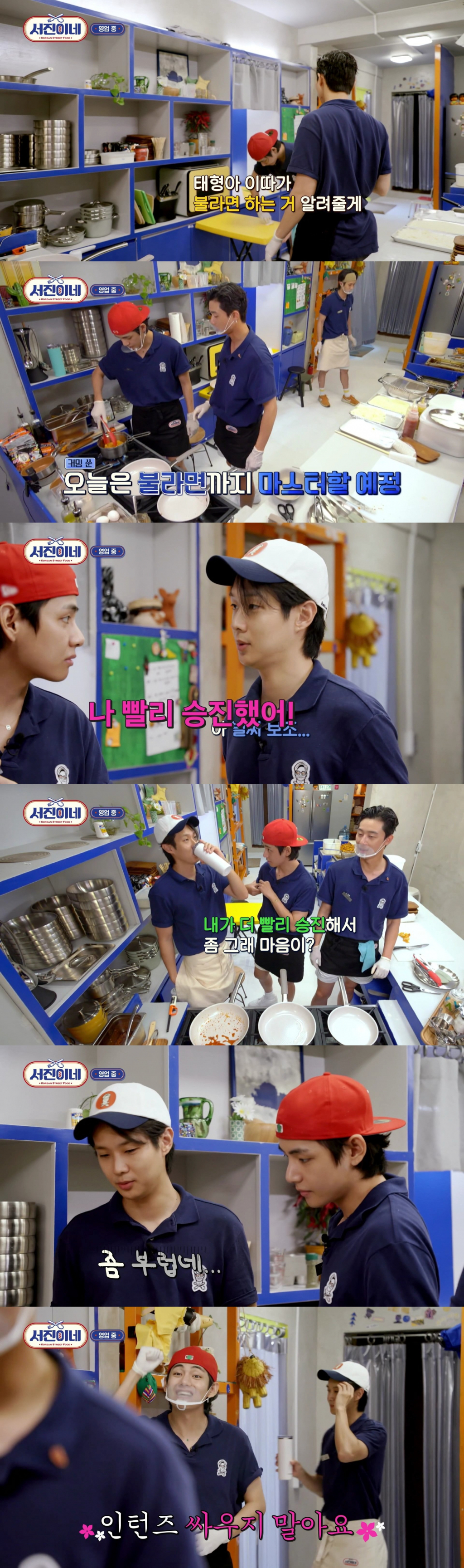 뷔는 자신이 보조 주방장이 됐다며 우식에게 "나 빨리 승진했어. 내가 더 빨리 승진해서 좀 그래 마음이?"라고 놀렸고, 우식은 "좀 부럽네"라고 답하며 꿀케미를 보여줬다.