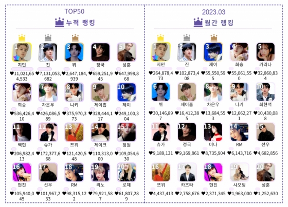 지민은 글로벌 팬들을 대상으로 하는 K팝 인기 투표 사이트 '케이돌'(KDOL)에서 3월 한 달간 총 2억 6487만 8473표를 받아 25회째 1위에 올랐다.