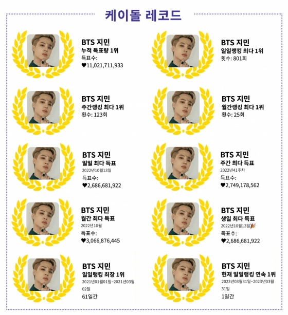 4월 1일 기준 지민은 케이돌 '명예의 전당' 일일랭킹 최다 1위(801회), 주간랭킹 최다 1회(123회), 월간랭킹 최다 1위(25회), 일일 최다 득표(26억 8668만 1922표), 주간 최다 득표(27억 4917만 8562표), 월간 최다 득표(30억 6687만 6445표), 생일 최다 득표(26억 8668만 1922표)에 이어 일일랭킹 최장 1위(61일간)와 현재 일일랭킹 연속 1위까지 명예의 전당 10개 부문 모두 1위로 전 세계 팬들의 전폭적인 사랑과 지지를 받고 있다.