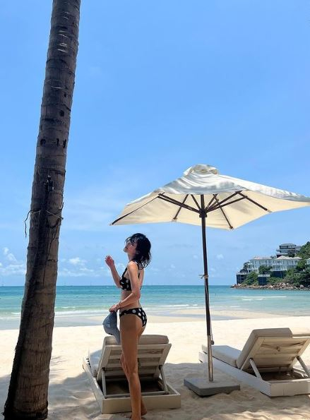 사진에서 채정안은 해변에서 물방울 무늬 비키니를 입고 포즈를 취했다.