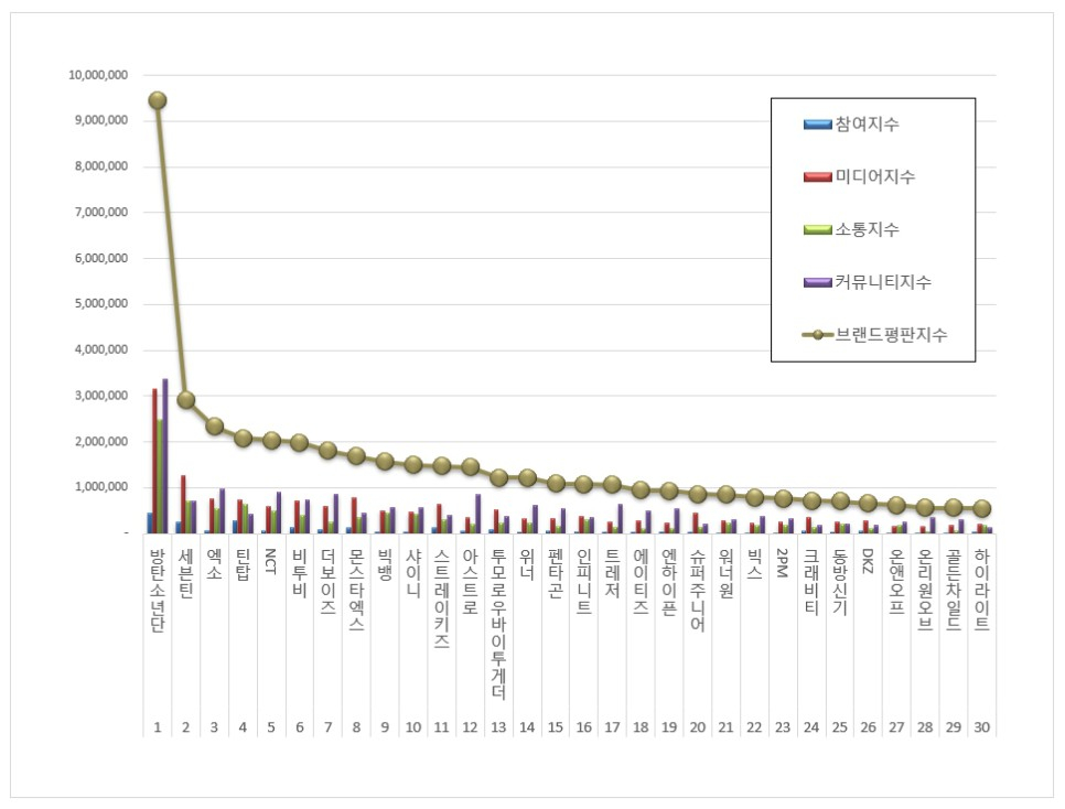 1위 방탄소년단 ( RM, 슈가, 진, 제이홉, 지민, 뷔, 정국 ) 브랜드는 참여지수 439,633 미디어지수 3,150,042 소통지수 2,483,535 커뮤니티지수 3,373,477가 되면서 브랜드평판지수 9,446,687로 분석됐다. 지난 3월 브랜드평판지수 5,907,810과 비교해보면 59.90% 상승했다.