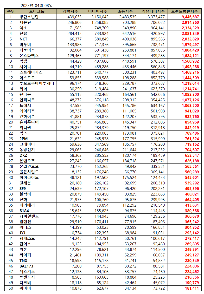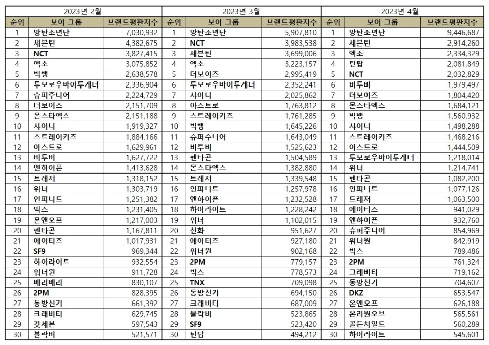 2023년 4월 보이그룹 브랜드평판 30위 순위는 방탄소년단, 세븐틴, 엑소, 틴탑, NCT, 비투비, 더보이즈, 몬스타엑스, 빅뱅, 샤이니, 스트레이키즈, 아스트로, 투모로우바이투게더, 위너, 펜타곤, 인피니트, 트레저, 에이티즈, 엔하이픈, 슈퍼주니어, 워너원, 빅스, 2PM, 크래비티, 동방신기, DKZ, 온앤오프, 온리원오브, 골든차일드, 하이라이트 순으로 분석됐다.