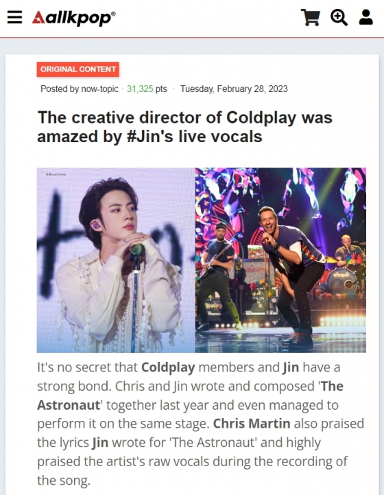 해외 연예매체 올케이팝(Allkpop)은 최근 "콜드플레이의 크리에이티브 디렉터가 진의 라이브 보컬에 놀랐다"는 제목의 기사에서 작곡, 작사부터 함께 하여 콘서트에서의 라이브 무대, SNL에서의 영어버전 라이브 등으로 발전한 '디 애스트로넛(The Astronaut)' 스토리를 언급하며 진과 콜드플레이 멤버들간의 다정한 케미스트리를 높게 평가했다.