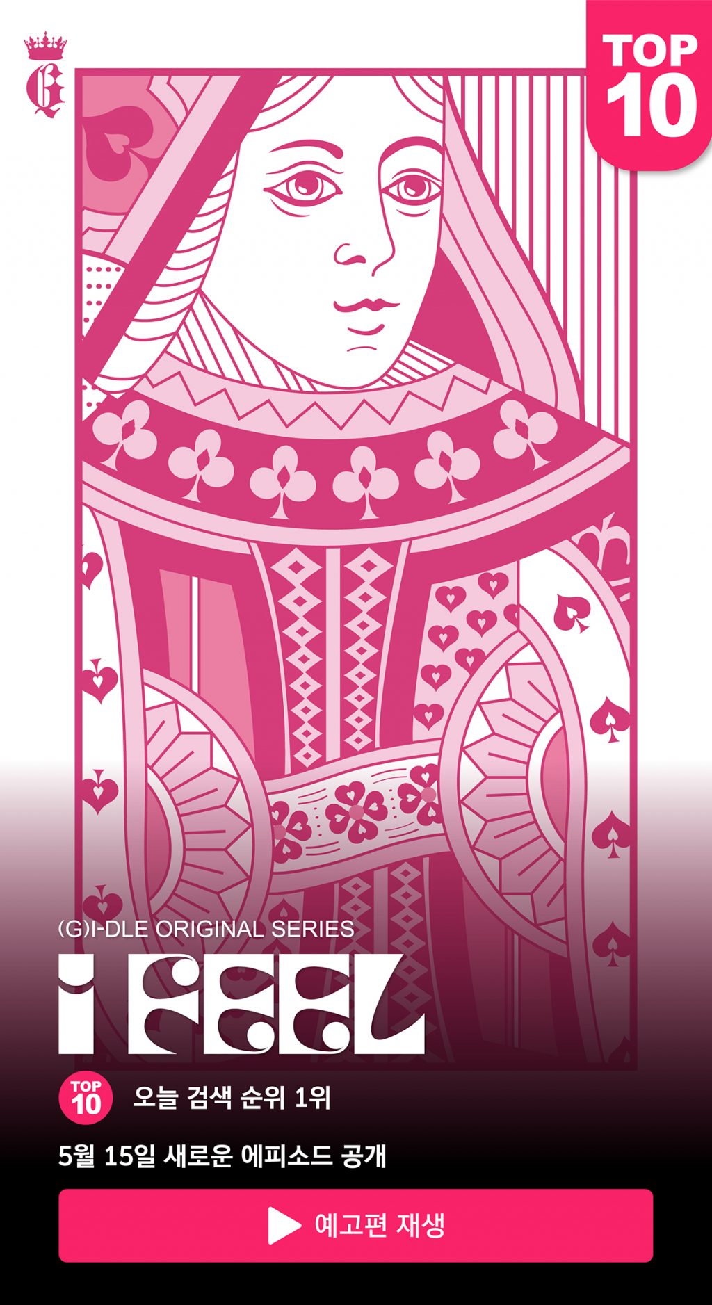 또한 우측 상단의 'TOP 10', 하단의 '(G)I-DLE ORIGINAL SERIES', '오늘 검색 순위 1위', '5월 15일 새로운 에피소드 공개' 등의 문구는 마치 OTT 플랫폼 메인 화면을 연상시키며 새 앨범에 대한 궁금증을 증폭시킨다. 이렇듯 신선한 콘셉트의 포스터가 공개된 후 (여자)아이들의 컴백을 기다려 온 팬들은 높은 관심과 기대감을 쏟아내고 있다.
