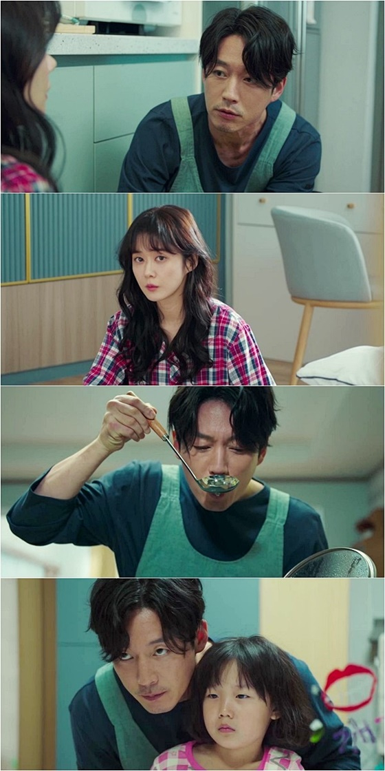공개된 스틸 속 권도훈은 석고대죄도 모자라 이번에는 앞치마를 두르고 폭풍 집안일에 나서고 있다. 국정원 블랙 요원으로 총을 겨누던 카리스마는 온데간데없이 아내 강유라의 눈치를 살피는 쭈구리 남편 면모가 웃음을 자아낸다. 특히 권도훈은 국의 간을 보며 아침 식사를 차리는가 하면, 딸 권민서(신수아 분)의 등교 준비를 도와주고 있다. 반면 강유라는 안방에 앉아 권도훈의 일거수일투족을 지켜보고 있다.