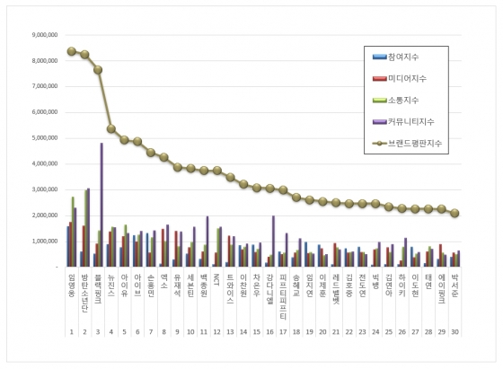 1위, 임영웅 브랜드는 참여지수 1,593,173 미디어지수 1,740,015 소통지수 2,730,587 커뮤니티지수 2,306,834가 되면서 브랜드평판지수 8,370,609로 분석됐다. 지난 3월 브랜드평판지수 6,494,742와 비교해보면 28.88% 상승했다.