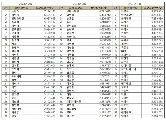 2023년 4월 스타 브랜드평판 30위 순위는 임영웅, 방탄소년단, 블랙핑크, 뉴진스, 아이유, 아이브, 손흥민, 엑소, 유재석, 세븐틴, 백종원, NCT, 트와이스, 이찬원, 차은우, 강다니엘, 피프티피프티, 송혜교 , 임지연 , 이제훈, 레드벨벳, 김호중, 전도연, 빅뱅, 김연아, 하이키, 이도현 , 태연, 에이핑크, 박서준 순으로 분석됐다.