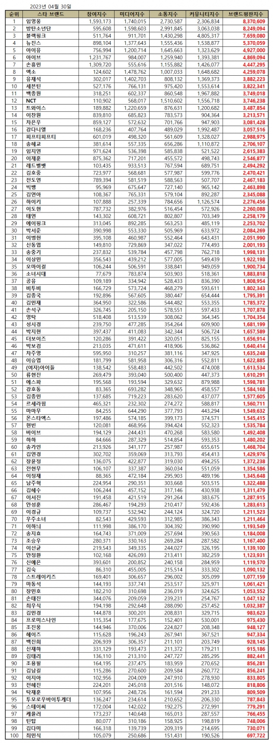 스타 브랜드평판 2023년 4월 빅데이터 분석 100위는 임영웅, 방탄소년단, 블랙핑크, 뉴진스, 아이유, 아이브, 손흥민, 엑소, 유재석, 세븐틴, 백종원, NCT, 트와이스, 이찬원, 차은우, 강다니엘, 피프티피프티, 송혜교 , 임지연 , 이제훈, 레드벨벳, 김호중, 전도연, 빅뱅, 김연아, 하이키, 이도현 , 태연, 에이핑크, 박서준, 이병헌, 신동엽, 송중기, 이상민, 오마이걸, 소녀시대, 공유, 비투비, 김종국, 김민재, 손석구, 영탁, 성시경, 박지현, 더보이즈, 박보검, 차주영, 이승엽, (여자)아이들, 류현진, 에스파, 강호동, 김종민, 르세라핌, 마마무, 몬스타엑스, 현빈, 바이브, 하하, 송가인, 김연경, 장윤정, 전현무, 이정재, 남주혁, 김혜수, 이서진, 안성훈, 이경규, 우주소녀, 이하늬, 송지효, 조승우, 이선균, 안정환, 신예은, 김숙, 스트레이키즈, 마동석, 장민호, 손태진, 최우식, 김민경, 프로미스나인, 조진웅, 헤이즈, 백진희, 신재하, 김태리, 조용필, 김남길, 이지아, 전혜진, 탁재훈, 투모로우바이투게더, 스테이씨, 케플러, 틴탑, 김다미, 최민식 순으로 분석됐다.