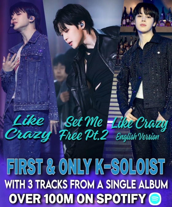 한편 지민은 현재 스포티파이 글로벌 아티스트에 50일간 차트인해 K팝 솔로 가수 최장 기록을 이어가는 중으로 '페이스' 앨범으로 써내려가는 신드롬급 인기를 통해 넘볼 수 없는 'K팝 프론트맨'의 위상을 여실히 보여주고 있다.