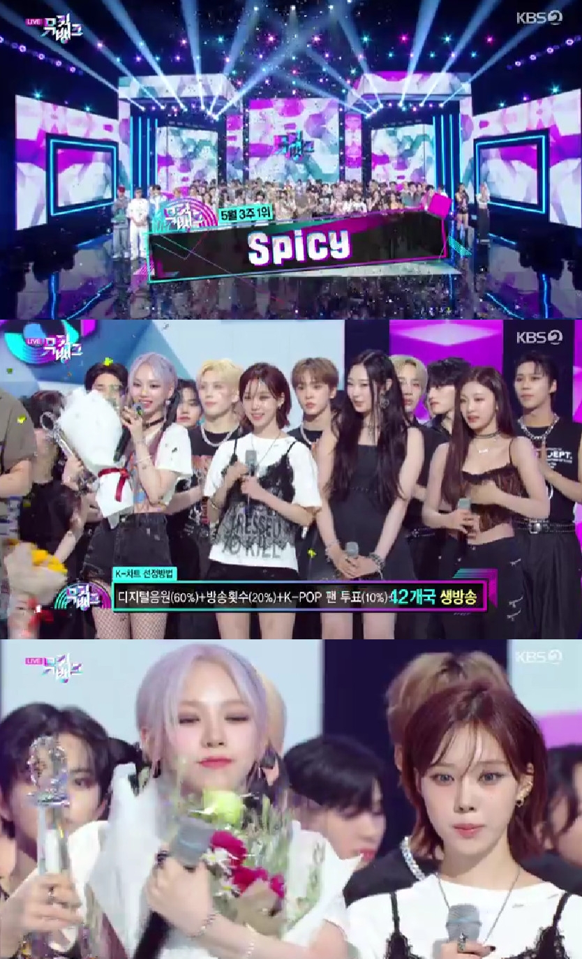 19일 방송된 KBS 2TV '뮤직뱅크'에서는 르세라핌 'Unforgiven'(언포기븐)과 에스파 'Spicy'(스파이시)가 1위 후보에 올랐다.