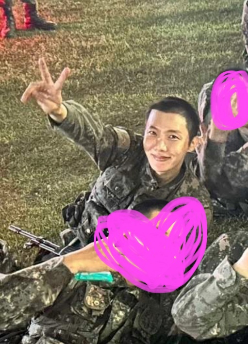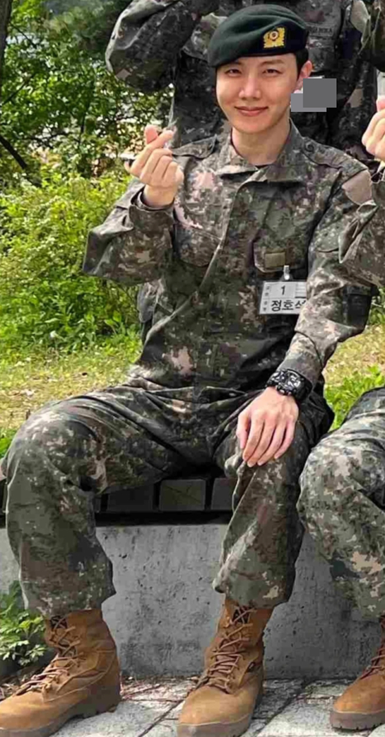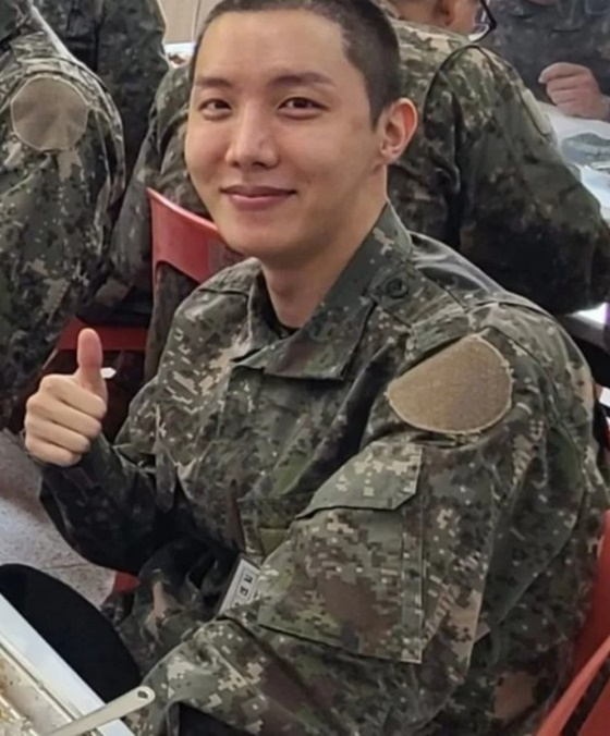 군모를 벗은 제이홉의 사진도 공개됐다. 제이홉은 짧은 반삭의 '까까머리'를 드러낸 채 브이자 포즈를 취하며 활기찬 군생활을 보여줬다. 그는 앞서 공개한 훈련소 사진들에서도 미소를 띤 모습으로 건강하게 군생활을 이어가고 있음을 알렸다.