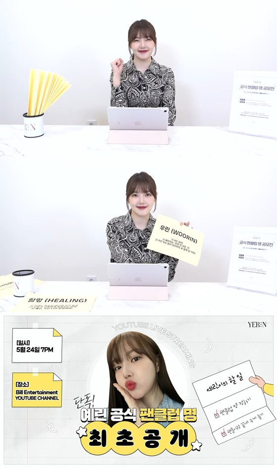 예린은 지난 24일 오후 7시 빌엔터테인먼트 유튜브 채널 'Bill Entertainment'(빌 엔터테인먼트) 라이브를 통해 팬클럽 명을 공개했다.