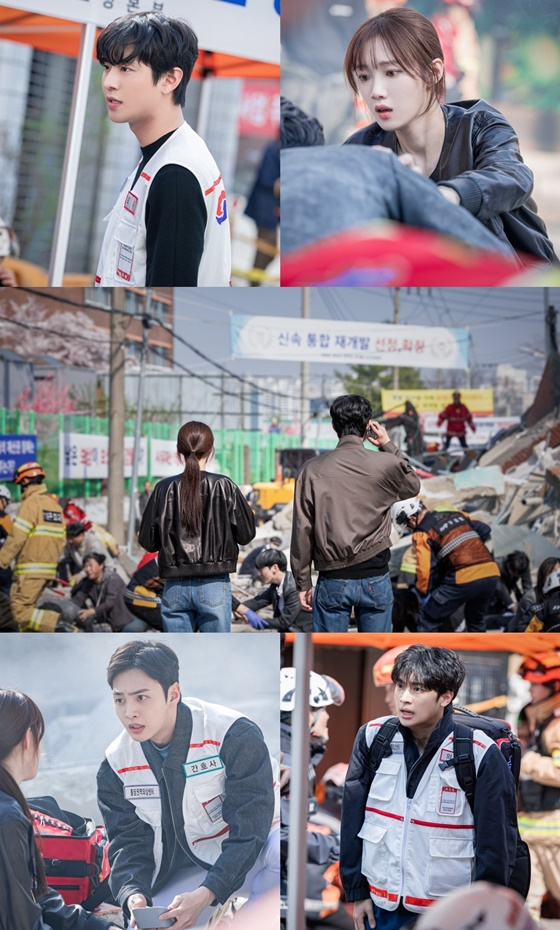 공개된 사진 속 건물 붕괴 장소에 도착한 서우진과 차은재는 눈 앞에 펼쳐진 참담한 현장을 바라보고 있다. 처참하게 무너진 건물과 다친 채 빠져나온 사람들의 모습도 포착됐다. 한쪽에서는 구급대원들이 구조를 진행 중인, 그야말로 아비규환의 상황이다. 급하게 현장에 온 듯 사복을 입고 있는 서우진, 차은재는 빠르게 상황을 파악하고 있다.