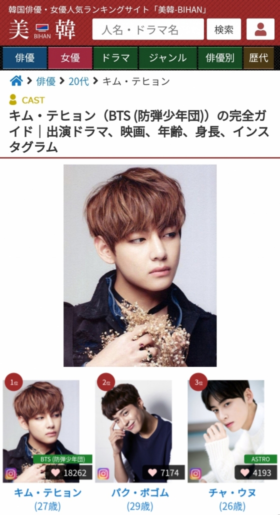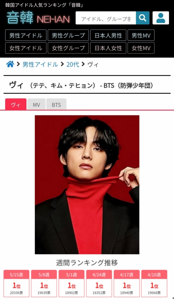 뷔는 5월 15일부터 5월 21일까지 일본 인기 아이돌 랭킹 사이트 '네한'(NEHAN)에서 실시한 'K팝 남자 아이돌 랭킹' 투표에서 2만 366표를 획득, 1위에 올랐다. 뷔는 112주 연속 1위 대기록을 세웠다.
