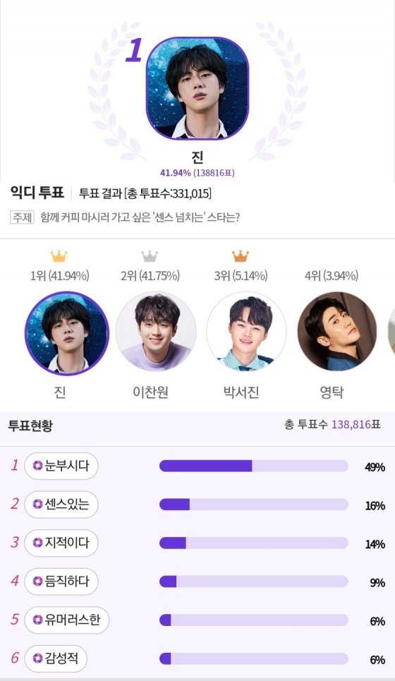 방탄소년단(BTS) 진이 '함께 커피 마시러 가고 싶은 스타' 1위에 오르며 인기를 빛냈다.