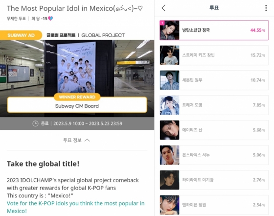정국은 5월 9일부터 5월 23일까지 아이돌챔프'(IDOLCHAMP) 글로벌 프로젝트로 진행된 '멕시코에서 가장 인기 있는 아이돌' 투표에서 44.55의 득표율로 1위를 차지했다.