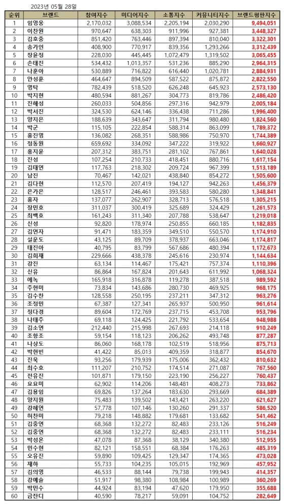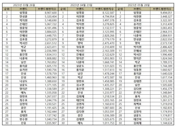 2023년 5월 트로트 가수 브랜드평판 30위 순위는 임영웅, 이찬원, 김호중, 송가인, 장윤정, 손태진, 나훈아, 안성훈, 영탁, 박지현, 진해성, 박서진, 양지은, 박군, 홍진영, 정동원, 홍지윤, 진성, 김태연, 남진, 김다현, 은가은, 홍자, 장민호, 최백호, 신성, 김연자, 설운도, 태진아, 김희재 순으로 분석됐다.
