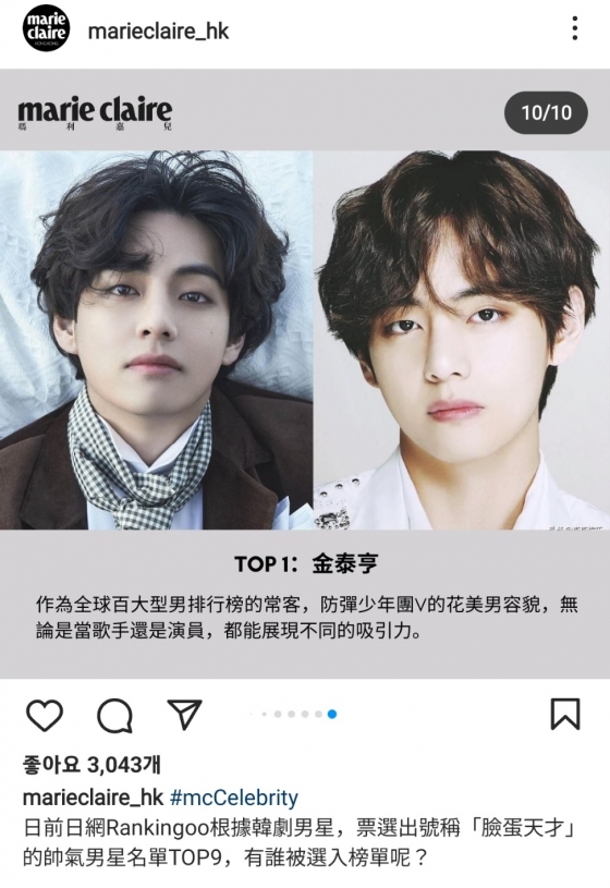 뷔는 또 일본 웹사이트 'Rankingoo'가 선정한 'K-드라마 남자 스타 얼굴천재 TOP 9'에서도 1위에 올랐다.