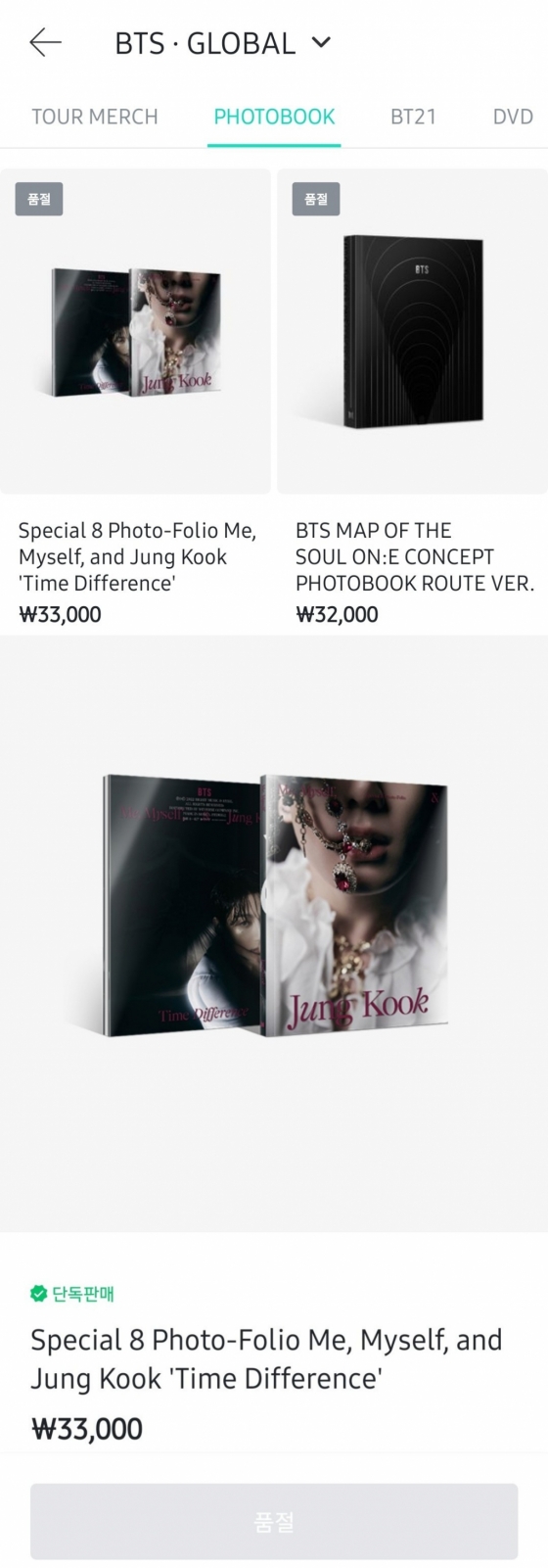 지난해 글로벌 팬 커머스 플랫폼 위버스샵에서 판매를 시작한 정국의 '스페셜 8 포토-폴리오(Special 8 Photo-Folio)', Me, Myself, and Jung Kook 'Time Difference' 개인 화보집이 글로벌에서 또 다시 품절됐다.