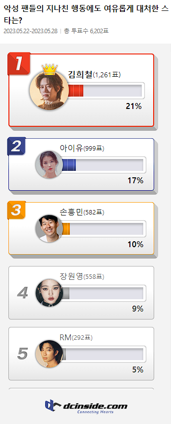 커뮤니티 포털사이트 디시인사이드(대표 김유식)가 `악성 팬들의 지나친 행동에도 여유롭게 대처한 스타는?`으로 투표를 한 결과 김희철이 1위에 올랐다. 이 투표는 지난 22일부터 28일까지 총 7일간 진행했다.