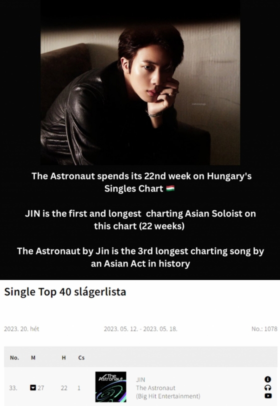 또한 총 5주의 1위를 기록하며 '아시아 솔로 최장 1위'란 신기록도 세웠다. 아시아 전체 최장 1위는 진이 속한 방탄소년단으로, 진은 헝가리 차트에 그룹과 솔로 모두 최정상을 차지한 아티스트로 명성을 빛냈다.