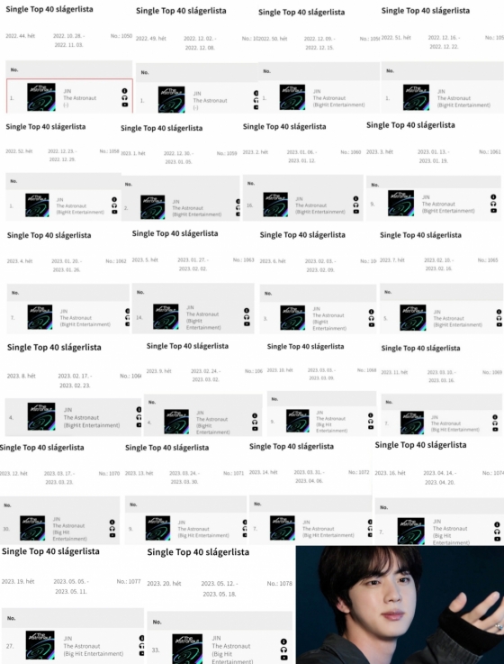 진의 '디 애스트로넛'은 발매와 동시에 헝가리 차트 1위에 오르며, 4주 연속 1위를 기록했다. 이는 '아시아 솔로 최초이자 최장 연속 1위'이다.