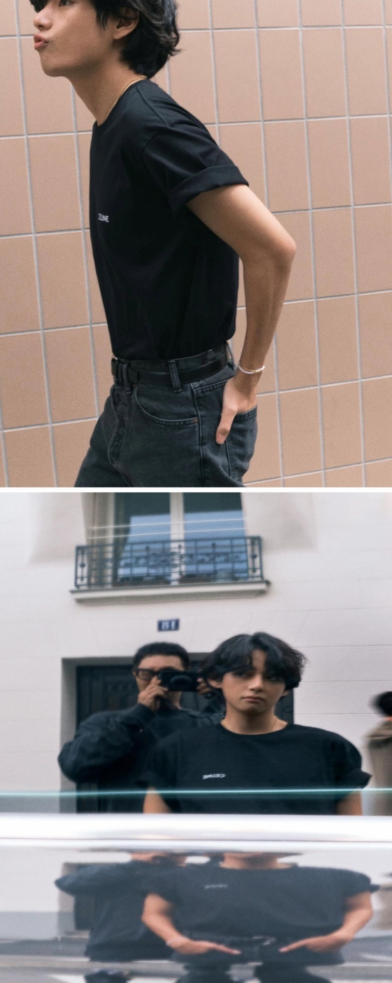 오래된 가옥을 배경으로 블랙티셔츠와 블랙진을 매치한 자연스런 스타일링으로 한 뷔는 자연광아래서 더 빛나는 빈틈없는 완벽한 외모, 슬림한 몸매로 시선을 사로잡았다. 프렌치시크룩을 대변하는 심플한 디자인의 블랙 의상은 시크하면서 세련된 분위기를 자아냈다.