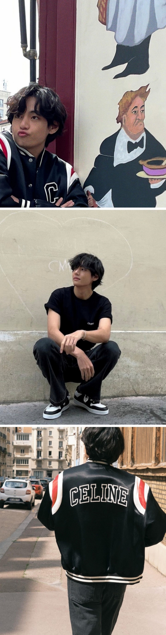 뷔는 공개에서 뷔는 글로벌 앰배서더로 활동하고 있는 셀린느의 제품을 착용하고 파리의 거리에서 자유로움을 만끽하고 있다.