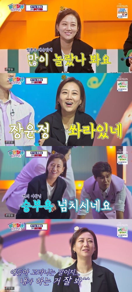 이날 장윤정은 MC 자리를 잠시 내려놓고 트롯 브라더스와 함께 게임에 도전, 한 번에 재생되는 여러 노래를 듣고 곡의 제목과 가수를 맞히는 '웃기는 짬뽕쏭' 게임에 나섰다.