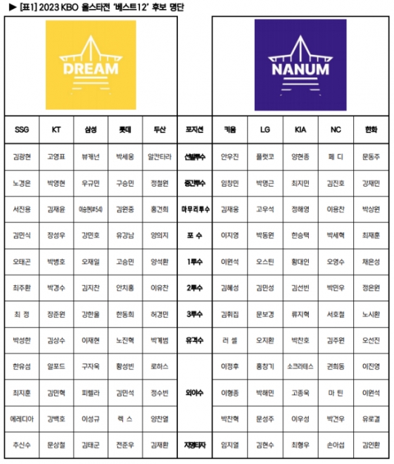 KBO는 "7월 15일 사직에서 개최되는 2023 신한은행 SOL KBO 올스타 '베스트12' 후보가 공개됐다"고 1일 밝혔다.