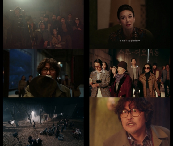 지난 5월 29일 공개된 해외 예고편은 고무줄을 튕기며 겨우 메가폰을 들고 "레디"를 외치는 '김감독'(송강호 분)의 목소리로 시작부터 몰입을 자아낸다. 걸작에 대한 '김감독'의 집념으로 시작된 영화 '거미집'의 재촬영에 하나둘씩 모이는 배우들. 여기에 "이게 진짜 가능해요?"라며 반대하는 제작자 '백회장'(장영남 분)의 대사는 재촬영 과정이 결코 순탄치 않을 것을 예고한다.