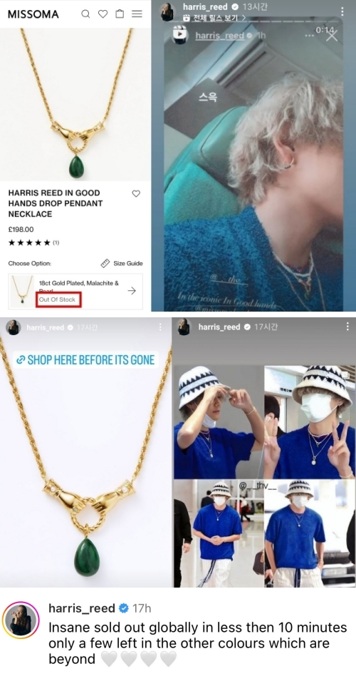 뷔가 착용한 그린 색의 목걸이는 프랑스 패션하우스 니나 리치(Nina Ricci)의 최연소 크리에이티브 디렉터가 된 해리스 리드(Harris Reed)의 액세서리 브랜드의 제품이다. 뷔가 자신의 제품을 착용한 사실을 알게 된 해리스는 뷔의 인스타그램을 리그램 했다.