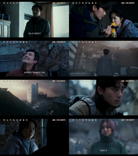 포스터와 함께 공개된 티저 예고편은 황궁 아파트의 주민 대표 '영탁'을 연기한 이병헌의 흡인력 있는 음성이 더해진 대사 "저는 이 아파트가 선택받았다, 그런 느낌을 받았습니다"로 시작부터 궁금증을 끌어올린다. 대지진으로 인해 모든 것이 폐허로 변해버린 세상, 유일하게 살아남은 아파트에서 생존을 위해 스스로를 지켜내야 하는 주민들의 모습을 담은 예고편은 캐릭터 간의 팽팽한 긴장감이 더해져 한 시도 눈 뗄 수 없는 몰입감을 선사한다.