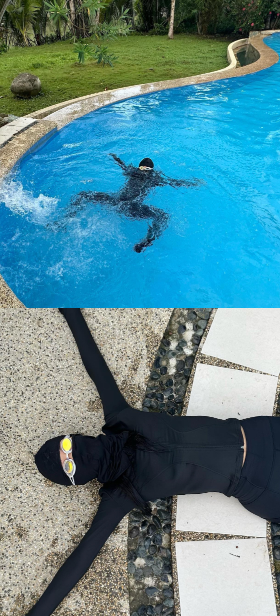 공개된 사진에는 해녀복을 연상시키는 수영복을 입고 머리부터 발끝까지 완전 무장한 이세희의 모습이 담겨 있다. 이세희는 물안경까지 쓰고는 수영장과 풀숲을 누비며 당당한 자태를 뽐내 폭소를 자아냈다.