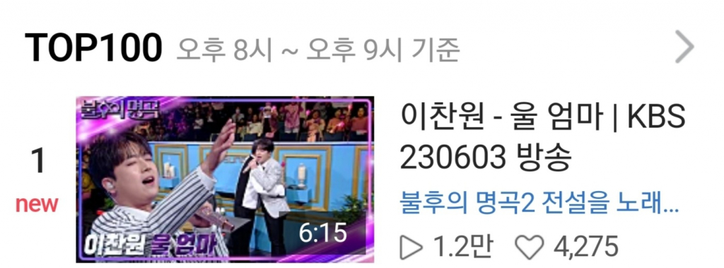 이찬원이 6월 3일 KBS 2TV '불후의 명곡2 전설을 노래하다'에 출연해 선보인 '울 엄마' 무대 영상은 이날 오후 오후 8시~오후 9시 네이버 TV TOP100 1위를 차지했다.
