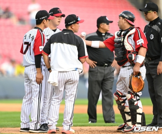 LG는 앞서 염 감독이 예고한 대로 불펜 데이로 맞섰다. 이미 2연패를 당한 상황에서 월요일은 휴식일인 상황. 이번 경기를 반드시 잡겠다는 필승 의지가 느껴졌다. 이에 선발 이지강을 내리는 '퀵 후크(3실점 이하 선발 투수를 6회 이전에 강판시키는 것)' 승부수를 띄운 채 두 번째 투수로 유영찬을 선택했다.