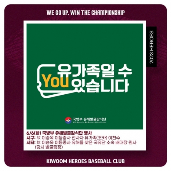 키움은 "6일 오후 2시 서울 고척스카이돔에서 열리는 LG 트윈스와 경기에서 국방부 유해발굴감식단과 함께 현충일 기념행사를 진행한다"고 밝혔다.