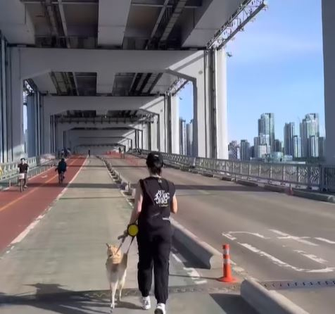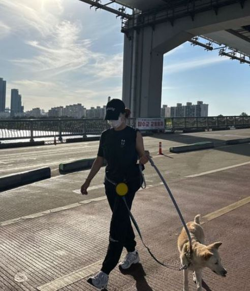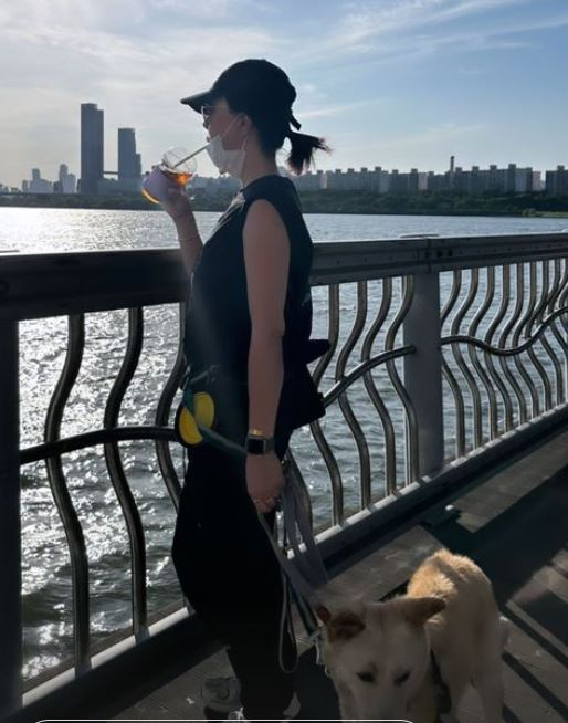 공개된 사진 속 엄정화는 반려견 슈퍼와 함께 한강 다리에서 운동을 하고 있다. 탄탄한 그의 몸매와 내츄럴한 패션이 보는 이들의 시선을 사로잡는다.