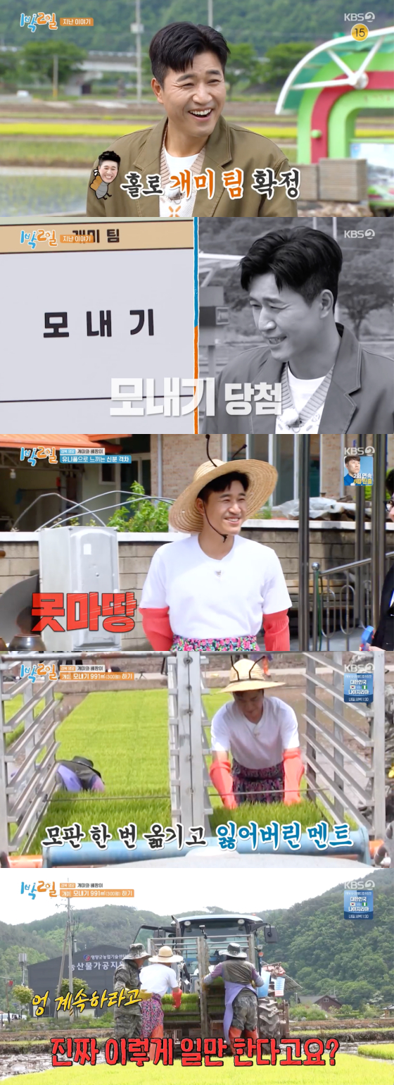 앞서 김종민은 음악에 맞춰 춤을 추지 않았다는 이유로 홀로 개미 팀에 당첨됐다. 김종민은 이에 무려 300평의 논에 모내기를 하게 됐다. 사장님은 "장정 3명이 하루 종일 해야 하는 크기다"며 겁을 줬고, 김종민은 경악하면서도 "해보겠다"며 모내기에 임했다.