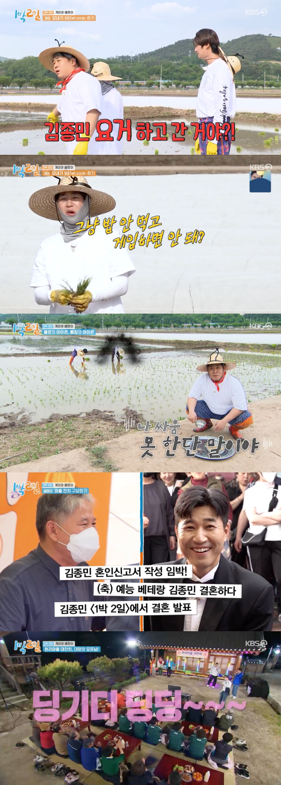 앞서 김종민은 개미, 남은 5인은 베짱이가 됐다. 김종민은 이에 무려 300평의 논에 모내기를 하게 됐다. 곧이어 사장님까지 "선수 교체하자. 사실 나도 안 해봤거든. 기계로만 해봤지. 해보니 잘 안 된다"는 폭탄 발언을 던지며 자리를 떠났고, 김종민은 이에 경악해 현장을 웃음바다로 만들었다. 김종민은 그럼에도 오전 내내 성실히 일했으나, 겨우 일곱 줄을 완성해 웃음을 더했다.