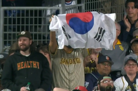 한 샌디에이고 팬이 4일(한국시간) 시카고 컵스전에서 태극기를 흔들고 있다. /사진=중계화면 갈무리